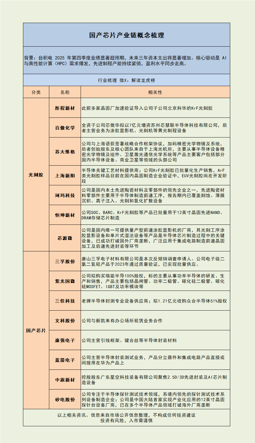 9:03 一、昨日热点AI+阿里:三江购物、石基信息AI+营销:利欧股份AI+医疗:美年健康AI+电力:三变科技商业航天:三维通信、海格通信年报业绩:长缆科技二、美国拟于2月实施载人绕月飞行任务美国航天局日前表示,计划不早于2月6日实施“阿耳忒弥斯2号”载人绕月飞行任务。这将是美国新一代登月火箭太空发射系统和猎户座飞船首次执行载人任务。按计划,在“阿耳忒弥斯2号”载人绕月飞行任务完成后,美国航天局将推进实施“阿耳忒弥斯3号”载人登月任务。商业航天概念三、苹果、高通争相抢购高端电子级玻璃纤维布由于AI热潮大幅推升需求,日东纺生产的高端电子级玻璃纤维布陷入短缺,苹果、高通等公司正争相抢购用于芯片基板和印刷电路板的玻璃纤维布。电子布:宏和科技、菲利华四、网络安全软件据外媒报道,有关部门已通知国内公司停止使用大约十几家美国和以色列公司生产的网络安全软件。网络安全:永信至诚、奇安信、亚信安全、三六零、绿盟科技五、行业要闻1、蓝思科技:近期已确定成为北美头部机器人客户首批核心供应商。(互动平台)2、常山药业:依诺肝素钠注射液获美国FDA批准,开启海外市场新征程。(官微)3、永鼎股份:子公司东部超导成功中标核工业西南物理研究院REBCO高温超导带材采购项目。(上海证券报)4、歌尔股份:字节正研发新一代豆包AI耳机,由歌尔股份代工。(蓝鲸新闻)5、《上海高级别自动驾驶引领区 “模速智行”行动计划》。(锦江在线、大众交通)6、市场监管总局对携程立案调查。(众信旅游、陕西旅游)7、英国AR7海风拍卖结果出炉,8.4GW超预期创历史新高。(大金重工、海力风电)8、三部门发布河套深港科技创新合作区深圳园区货物进出口有关税收政策的通知。9、三部门将支持居民换购住房的个人所得税退税政策延续至2027年12月31日。10、财政部召开财政金融协同促内需一揽子政策全国推进工作视频会议。11、调整融资保证金比例从80%提高至100%,1月19日施行。12、美国14日宣布,从15日起对部分进口半导体、半导体制造设备和衍生品加征25%的进口从价关税。13、国务院新闻办公室将于1月15日(星期四)下午3时举行新闻发布会,介绍货币金融政策支持实体经济高质量发展成效。 -