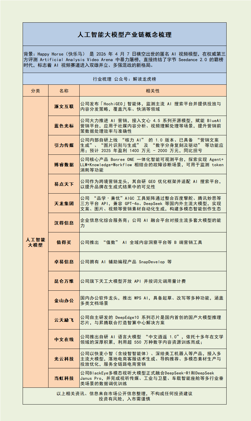 12:52 AI漫剧迎来“产能井喷”时刻,算力需求加速释放中文在线:公司在红果短剧app上线短剧作品超450部,自2024年5月起独家联合首发23部短剧欢瑞世纪:公司与红果短剧有业务合作德才股份:公司旗下奇想无限公司入驻火山引擎生态并联合推出“漫剧AI工坊”;深度绑定红果短剧,实现“生产即分发”引力传媒:1、公司与字节旗下豆包大模型及火山引擎自2023年底起逐步深化合作,构建起”技术+创意+营销”的AI营销生态闭环。2、引力传媒在2025年8月28日宣布,布局AI漫剧,招聘AI、动漫人才。利通电子:载至2025年10月底公司现有算力规模近33,000P首都在线:公司现有算力10000P;公司已规划自建数据中心未来具备支持超过5万P算力的能力天地在线:公司现已构筑了多元化内容制作体系,凭借自身全域媒体资源、多元化内容生产、全链路内容运营等服务优势和业务能力,可满足客户在内容承制、切片素材制作、营销推广、品牌代运营等不同环节的服务需求中安科:公司及全资子公司灵算智云(武汉)投资有限公司与宜兴兴阳产业投资有限公司签署了投资合作协议,双方将共建宜兴市人工智能算力中心项目。捷成股份:公司已经在国内和海外发行了超百部漫剧;积极开展Al漫剧内容的生产发行及相关AI技术的研发杭钢股份:2024年7月25日公告,公司全资子公司数据公司近期中标算力服务采购项目,拟投资37436万元采购AI服务器、网络存储等设备,搭建整体算力不低于68Pflops的算力集群。大位科技:大位数据科技(广东)集团股份有限公司的主营业务是互联网数据中心与算力服务。公司的主要产品是机柜租赁服务、网络传输及增值服务、算力与云服务、运维服务。 -