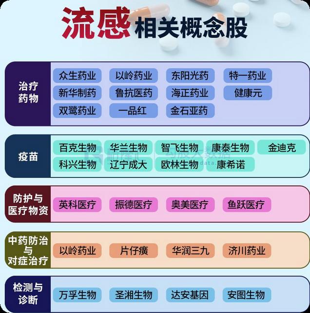 6:38 国内流感活动目前呈现显著抬头趋势,本周南北方流感样病例报告ILI%及流感病毒检测阳性率均环比升高。日本、英国等地流感疫情持续,活动性高于往年同期水平。目前国内优势毒株以A(H3N2)亚型为主,新版流感疫苗接种指南对A(H3N2)亚型疫苗组分进行了更换。流感概念股如下: