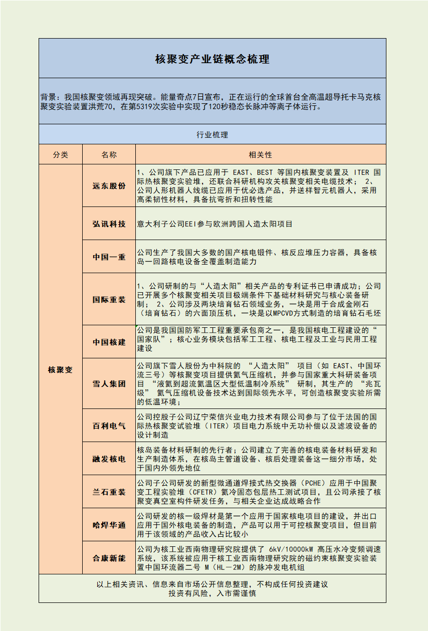 9:11 一、昨日热点公告涨停:锋龙股份、美克家居、胜通能源脑机接口:创新医疗、南京熊猫、岩山科技商业航天:鲁信创投、银河电子、雷科防务反制(光刻胶):彤程新材、国风新材反制(渔业):中水渔业微通道:远东股份、江顺科技变压器:三变科技消费:友阿股份煤炭:安泰集团超聚变IPO:东方明珠核聚变:弘讯科技、中国一重二、反制升级 商务部对原产于日本的进口二氯二氢硅发起反倾销调查商务部7日发布公告称,对原产于日本的进口二氯二氢硅进行反倾销立案调查。二氯二氢硅产品主要用于生产逻辑芯片、存储芯片、模拟芯片和其他类芯。二氯二氢硅:三孚股份、和远气体、金宏气体、华塑股份三、120秒稳态运行 我国核聚变再现突破国核聚变领域再现突破。能量奇点7日宣布,正在运行的全球首台全高温超导托卡马克核聚变实验装置洪荒70,在第5319次实验中实现了120秒稳态长脉冲等离子体运行。这一实验结果标志着洪荒70已经具备可靠的长脉冲运行能力,进一步验证了高温超导托卡马克的工程可靠性和运行稳定性。这也是全球首次,由一家商业公司研发建造的核聚变装置,成功实现了百秒量级的等离子体电流长脉冲运行。2026核聚变能科技与产业大会1月16日至17日在安徽合肥举办。能量奇点参股:浙江东方能量奇点供应商:国机重装、精达股份、永鼎股份、国光电气核聚变:弘讯科技、中国一重、中国核建、雪人集团北交所+核聚变:常辅股份四、《人工智能+制造专项行动实施意见》、《工业互联网和人工智能融合赋能行动方案》《人工智能+制造专项行动实施意见》。到2027年,我国人工智能关键核心技术实现安全可靠供给,产业规模和赋能水平稳居世界前列。推动3-5个通用大模型在制造业深度应用,形成特色化、全覆盖的行业大模型,打造100个工业领域高质量数据集,推广500个典型应用场景。支持突破高端训练芯片、人工智能服务器、智算云操作系统等关键核心技术,开发适应制造业实时性、可靠性、安全性特点的高性能算法模型。《工业互联网和人工智能融合赋能行动方案》。强化工业智能算力供给。加快工业互联网与工业互联网通算中心、智算中心、超算中心融合应用,鼓励公共算力服务商向工业企业提供服务。工业互联网:鼎捷数智、东土科技、中控技术、宝信软件算力芯片:寒武纪、摩尔线程、沐曦股份、东芯股份五、美能源部长宣称将无限期控制委内瑞拉石油销售1、国能源部长克里斯赖特宣称,委内瑞拉石油的销售将由美国政府控制,不仅包括库存,还包括今后无限期的销售,销售收入将存入美国政府控制的账户。2、国将从委内瑞拉获得5000万桶此前受制裁的石油,这些石油将由美国代表委内瑞拉进行销售,其中部分原油原本是可能会被直接售予中国的。石油:山东墨龙、准油股份、通源石油北交所+石油:科力股份六、美股脑再生科技涨超60% 三日涨幅翻倍1、美股脑再生科技涨超60%。1月5日上涨31%,1月6日上涨22%,1月7日上涨60%,三日涨幅已翻倍。工信部等八部门印发《“人工智能+制造”专项行动实施意见》,其中提出,加快脑机接口等新型终端的产业化、商业化进程。2、脑机接口产业联盟宣布,脑机接口产业联盟、脑机交互与人机共融海河实验室、天津大学拟于2026年2月3日至4日在天津举办“2026脑机接口开发者大会”。脑机接口:创新医疗、南京熊猫、岩山科技、普利特七、行业要闻1、学习时报刊文何为“票根经济”,以各类演出、赛事、展览、旅游、交通等活动的票根为载体,通过对票根的收集、交易、二次开发等方式形成的经济活动。(锋尚文化、三峡旅游)2、泽连斯基称有望在2026年上半年结束俄乌冲突。(北新路桥、北方国际)3、《直播电商监督管理办法》发布。(遥望科技、天下秀)4、邮政局:邮政行业将出台加快推广应用无人配送技术政策文件。(中邮科技)5、国家能源局印发《可再生能源绿色电力证书管理实施细则(试行)》。(绿色电力)6、从国家药监局获悉,为加快临床急需境外已上市药品在境内上市,满足患者临床用药迫切需求,国家药监局进一步优化这类药品审评审批。(创新药) -
