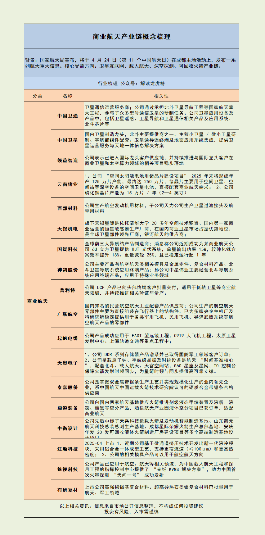 9:14 一、昨日热点光通信:天通股份、剑桥科技液冷:圣阳股份、康盛股份算力:品高股份固态电池:宝丽迪一季报:博云新材二、国产光纤全球爆单 部分产品价格暴涨650%央视财经:今年以来,光纤行业呈现出产品量价齐升的景气态势。在江苏一家光纤生产企业,工作人员告诉记者,今年一季度,光纤产品产销量同比增长35%以上,其海外销量增速超55%。现在的在手订单很充足,我们现在排产已经排到明年的一季度。在江苏的另一家光纤生产企业,负责人告诉记者,今年一季度光纤产销量同比增长近5倍。与此同时,产品价格也出现大幅上涨。价格是爆发性的增长,G.657.A2光纤去年是每芯公里32元,今年涨到了240元,涨幅达到了650%。光纤:长飞光纤、亨通光电、烽火通信、中天科技三、荣耀闪电机器人半程马拉松夺冠 超过人类纪录4月19日北京亦庄人形机器人半程马拉松,荣耀闪电机器人50分26秒成绩夺冠,人类半马的世界纪录为56分42秒。该机器人冷热散热核心系统高速悬浮泵供应商来自上海企业华科冷芯。领益智造为荣耀夺冠机器人供应全套结构件和表面处理。荣耀机器人的132款核心金属结构件由蓝思科技打造,覆盖头部、手臂、髋部、腿部等关键运动单元。机器人液冷:飞荣达(华科冷芯)机器人结构件:领益智造、蓝思科技荣耀参股:爱施德、天音控股四、DeepSeek启动首次外部融资 V4跑分图泄露有关国内AI巨头DeepSeek可能正启动首次外部融资的消息,在业内持续传播。对此,某大型国资股权机构人士表示,有渠道反馈,DeepSeek正启动首次外部融资的消息很有可能属实,目前完全投不进去,更多信息不便透露。DeepSeek-V4跑分图泄露,跑分领先海外一线模型,但该信息仍未得到证实。Deepseek:每日互动、杭钢股份昇腾:川润股份、华丰科技、泰嘉股份、航天电器五、4月24日中国航天日 重大信息发布在即1、从国家航天局获悉,今年中国航天日主题是“七秩问天路 携手探九霄”,主场活动将在四川省成都市举办。中国航天日主场活动包括启动仪式、航天科普系列展览等,同期还将举办中国航天大会、航天科普进校园、技术交流等活动。启动仪式于4月24日上午举办。在4月24日启动仪式及后续中国航天大会(4月23-26日)期间,将集中发布深空探测规划、商业航天扶持政策、嫦娥五号样品研究成果等一系列重大信息。2、4月19日19时25分,美国蓝色起源公司发射一枚翻新的“新格伦”重型运载火箭,并成功在海上回收了火箭第一级箭体。3、长十乙或于4月28日-30日开展首飞任务并尝试网系回收,有望成为我国首款实现回收的火箭。长十乙可回收:航天工程、巨力索具、海兰信商业航天:航天动力、航天发展、航天机电、航天电子六、行业要闻1、税务总局调整平潭综合实验区有关增值税和消费税退税货物范围。(平潭发展)2、晶圆代工厂联电下半年调价,涨幅最高或达15%。(中芯国际、华虹公司、晶合集成)3、广交会爆款订单起飞,中国无人机订单飞涨。(中无人机、航天彩虹)4、农业农村部召开生猪产业发展座谈会:要进一步完善生猪产能综合调控政策 采取有力有效举措推动猪价合理回升。(天邦食品)5、三星退出LPDDR4/4X市场。(兆易创新、北京君正)6、游戏工委:一季度中国游戏市场实际销售收入971.72亿元,同比增长13.38%。(游戏)7、张雪机车WSBK荷兰站第一回合正赛第四,第二轮正赛第七。8、港交所征求意见:将股票现货市场结算周期从T+2缩短至T+1。(券商)9、4月17日伊朗宣布开放霍尔木兹海峡,18日晚重新关闭霍尔木兹海峡。特朗普称仍然认为可以与伊朗达成和平协议。 -